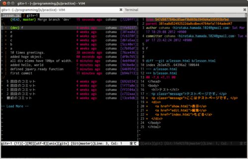 前回に引き続き、今回も Vim + Git ネタですが・・・。vimshell や fugitive.vim を使っているとほとんどの操作を Vim 上で実現できるます。でも、gitk だけは別ウィンドウで起動しなければならず面倒だと思っていました。 Vim 上で gitk 的なことを行うプラ…
